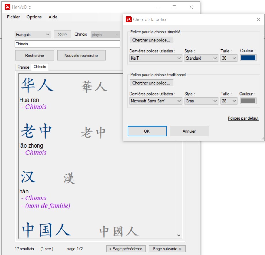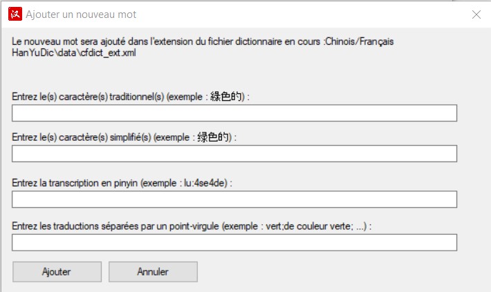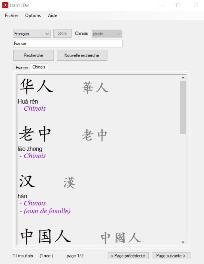 HanYuDic est un dictionnaire chinois-français/anglais/allemand à installer en local sur son ordinateur. Cette application contient en elle les bases de données du dictionnaire et n'a donc pas besoin de connexion internet pour fonctionner.